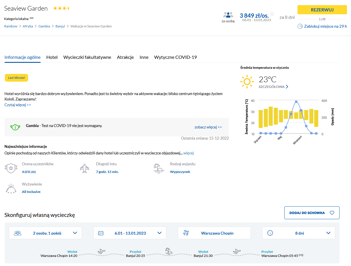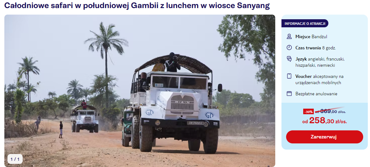 Do Afryki udasz się w terminie 6 – 13 stycznia, oszczędzając dodatkowy dzień urlopu (6 stycznia to ustawowo wolny dzień od pracy – święto Trzech Króli). Czeka cię bezpośredni lot z Warszawy do Bandżulu. W cenę wycieczki wliczono bagaż rejestrowany (nadawany do luku).