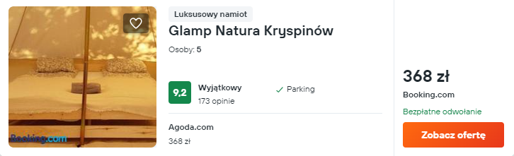 Tym razem proponuję zatrzymać się w niezwykłym miejscu. Glamp Natura Kryspinów oferuje noclegi tuż nad zalewem, w komfortowo urządzonych namiotach. Dla gości przygotowano prywatną plażę, ogród z miejscem na grilla oraz możliwość wypożyczenia rowerów.