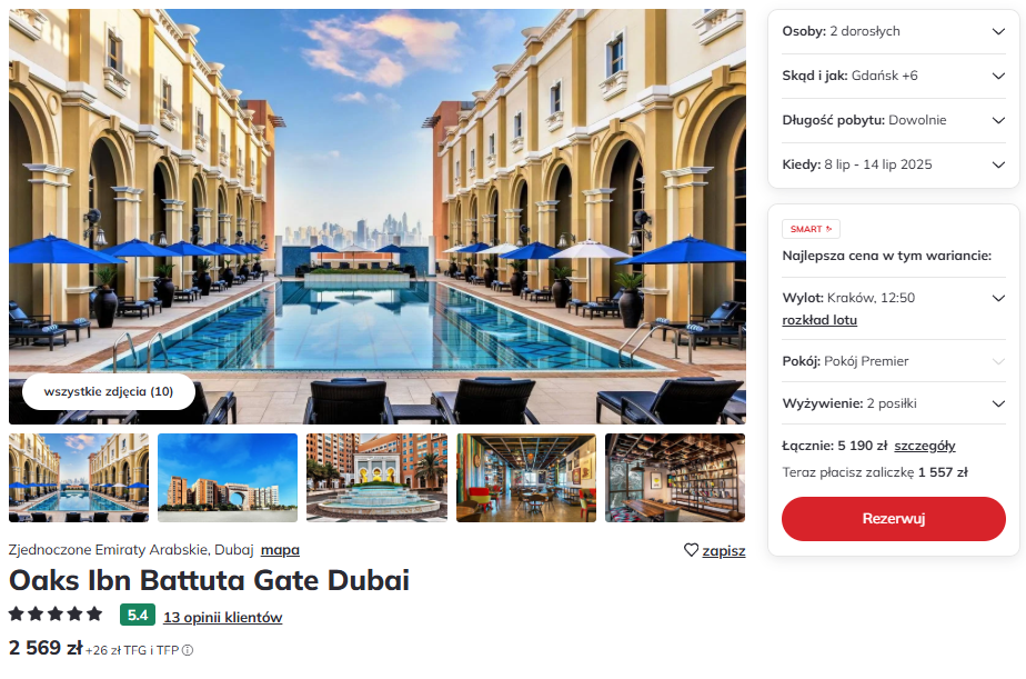 Na wycieczkę wybierzesz się w terminie 8-14 lipca. Do Dubaju polecisz bezpośrednio z lotniska w Krakowie. W cenę wliczone są loty z bagażem rejestrowanym, podstawowe ubezpieczenie, transfery na trasie lotnisko-hotel-lotnisko oraz śniadania i obiadokolacje.