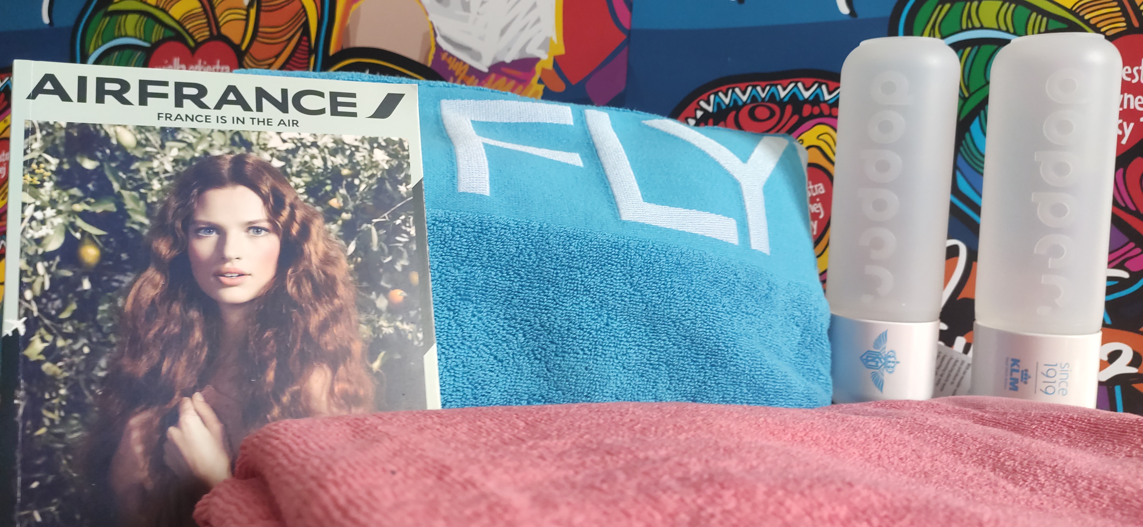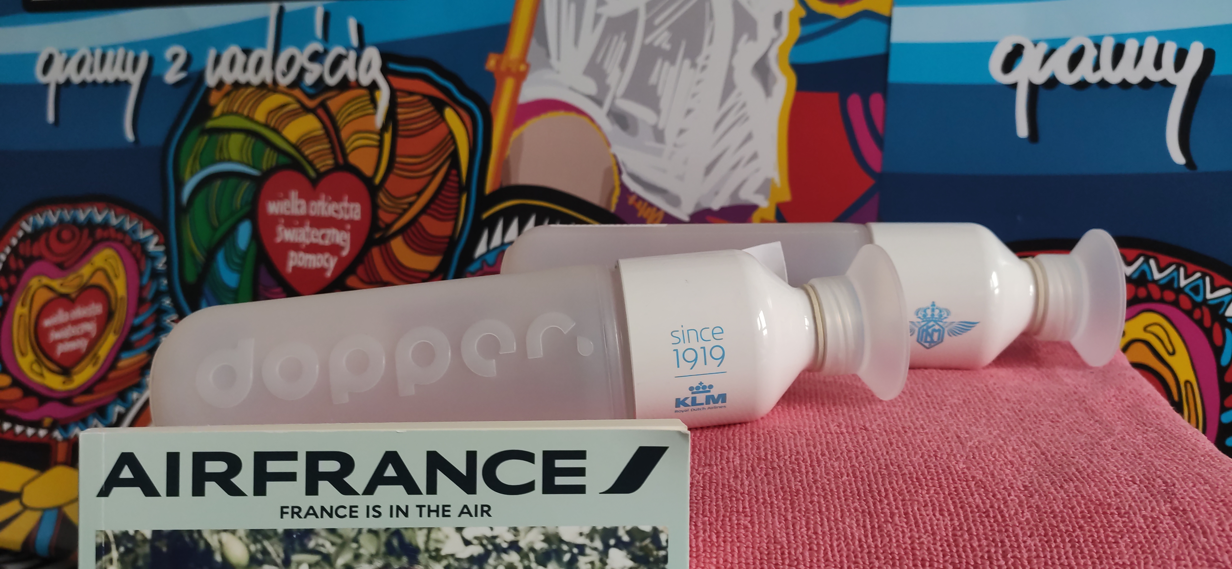 Do wylicytowania zestaw podróżnika linii KLM-Air France, w którym znajdują się: duży kąpielowy ręcznik w kolorze niebieskim, duży kąpielowy ręcznik w kolorze różowym, dwa bidony na wodę oraz notatnik.