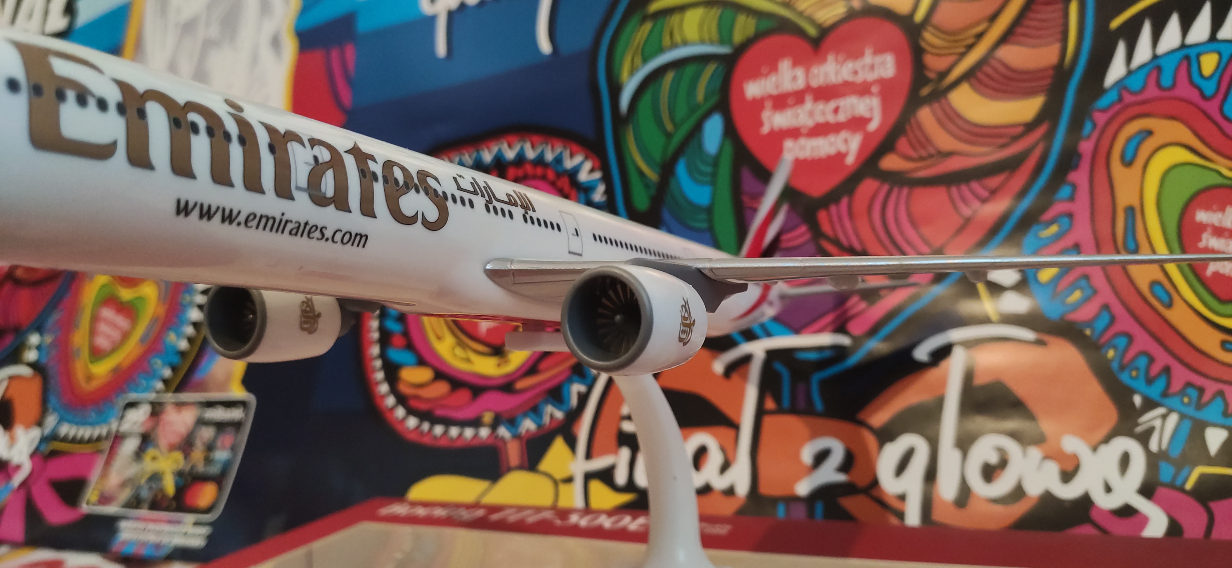 Kolekcjonerski model samolotu Boeing 777-300 ER w skali 1:200 w barwach linii lotniczej Emirates, która wielokrotnie została uznana za najlepszego przewoźnika lotniczego przez Skytrax World Airline.