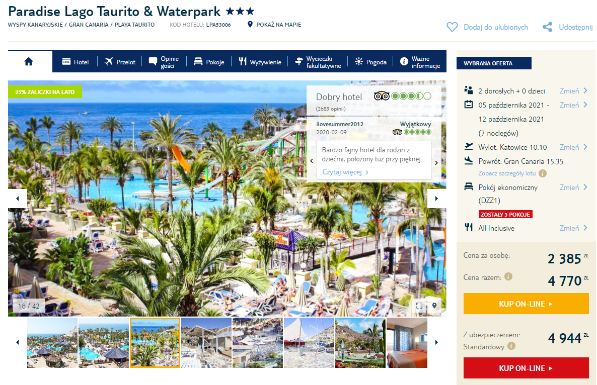 Na Wyspach Kanaryjskich będziecie zakwaterowani w bardzo dobrze ocenianym 3* hotelu Paradise Lago Taurito & Waterpark. Będzie to świetny wybór na rodzinny urlop: w pobliżu znajduje się piaszczysta plaża, a wy będziecie mogli zaszaleć również w aquaparku (darmowy wstęp dla gości hotelu). Dorzućcie do tego także bogate zaplecze sportowe, elegancką strefę spa oraz wyżywienie z all inclusive, a jasnym będzie, że w czasie tego wyjazdu nie będziecie musieli się o nic troszczyć.