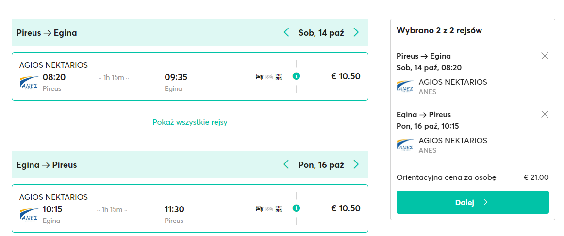 Następnie w Pireusie wsiądziesz na pokład promu należącego do armatora Agios Nektarios. W terminie 14 – 16 października zabierze cię on na wyspę Egina. Za bilety w obie strony zapłacisz 21 EUR (ok. 93 PLN).
