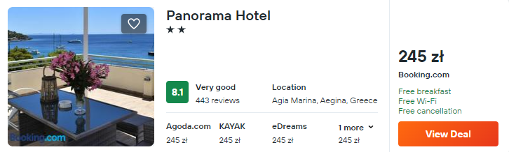 Na wyspie Egina rozważ noclegi w położonym tuż nad morzem hotelu Panorama. W cenę pobytu wliczono codzienne śniadania.