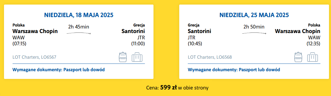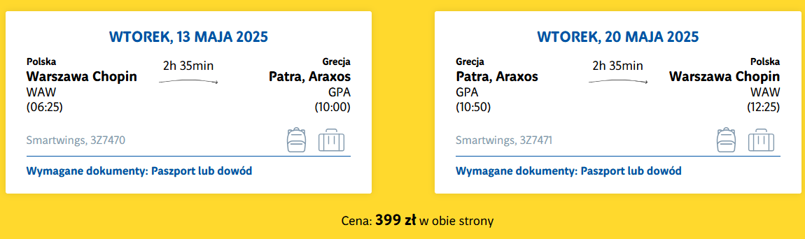 W podróż wybierzesz się w maju z Warszawy, Czeka cię lot do Araxos lub na Santoryn z PLL LOT lub Smartwings. W cenie możesz zabrać bagaż rejestrowany (nadawany do luku).