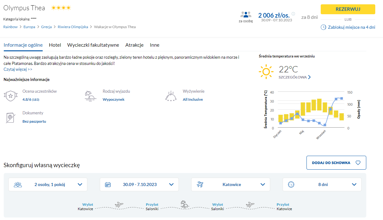W podróż do Grecji udacie się w terminie 30 września – 7 października. Czeka was bezpośredni lot do Salonik, a jako miejsce wylotu macie do wyboru Katowice oraz Warszawę. W cenę pakietu wliczono bagaż rejestrowany, transfery oraz opiekę rezydenta.