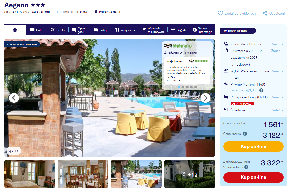 Wczasy w Grecji zaplanowane zostały w terminie 24 września – 1 października. Czeka cię bezpośredni lot z Warszawy do Mityleny, realizowany na pokładzie samolotu linii lotniczej Enter Air. Będziesz mógł zabrać ze sobą bagaż podręczny i rejestrowany (nadawany do luku).