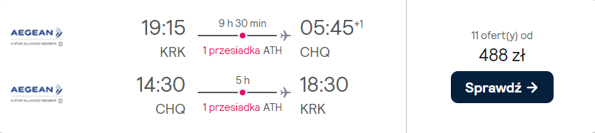 W obie strony polecisz na pokładach samolotów linii Aegean Airlines z wygodnymi przesiadkami w Atenach. Bez dodatkowych kosztów na wycieczkę zabrać możesz bagaż podręczny o standardowych wymiarach oraz przedmiot osobisty.