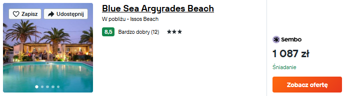 Na wyspie wybrałem dla ciebie zlokalizowany niedaleko wybrzeża 3* hotel Blue Sea Argyrades.W miejscowości, w której się zatrzymasz, znajdziesz kilka barów i restauracji. Dodatkowo w cenie noclegu otrzymasz śniadania.
