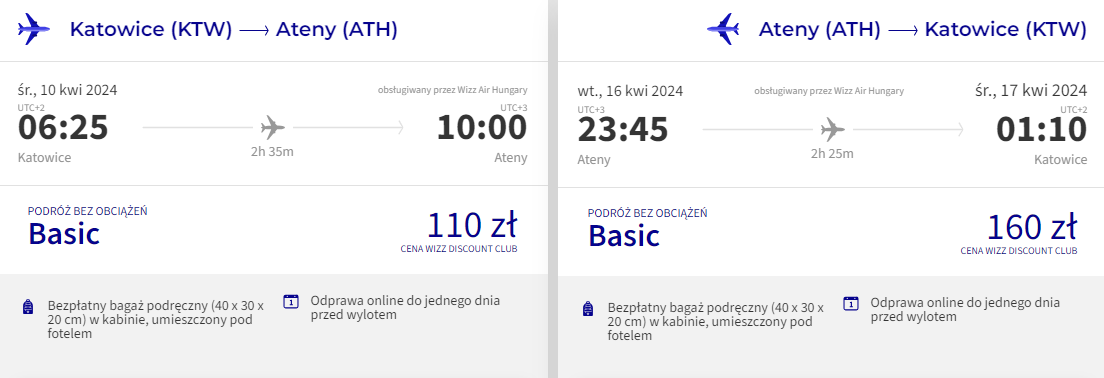 Do Grecji udasz się w terminie 10 – 16 kwietnia. Zacznij od rezerwacji bezpośredniego lotu z Katowic do Aten. Odbędzie się on na pokładzie samolotu linii lotniczej Wizz Air. Bez dodatkowych opłat możesz zabrać sam bagaż podręczny. Najtańsze bilety dostępne są dla członków Wizz Discount Club.