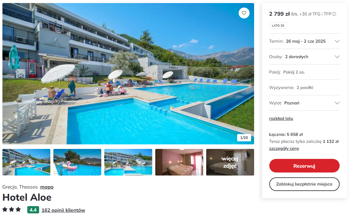 W cenę pakietu wliczone są przeloty z dużym bagażem, transfer autokarem i promem z Kawali, zakwaterowanie, wyżywienie (śniadania i obiadokolacje) oraz podstawowe ubezpieczenie.