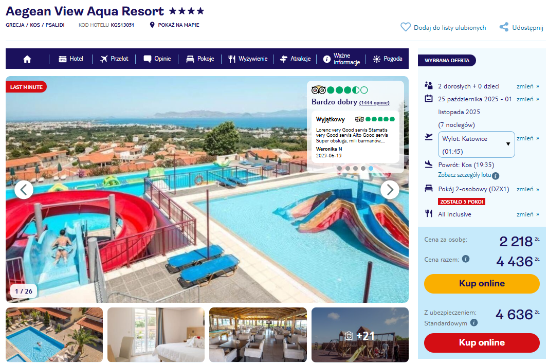 Aegean View Aqua Resort położony jest w spokojnej dzielnicy Psalidi, około 3 km od plaży. Goście chwalą hotel za przyjazną atmosferę, smaczne jedzenie oraz piękne widoki na Morze Egejskie. Resort oferuje aquapark z basenami i zjeżdżalniami, co jest szczególnie doceniane przez rodziny z dziećmi. Z hotelu można łatwo dostać się do centrum miasta Kos, gdzie czekają liczne tawerny i atrakcje.