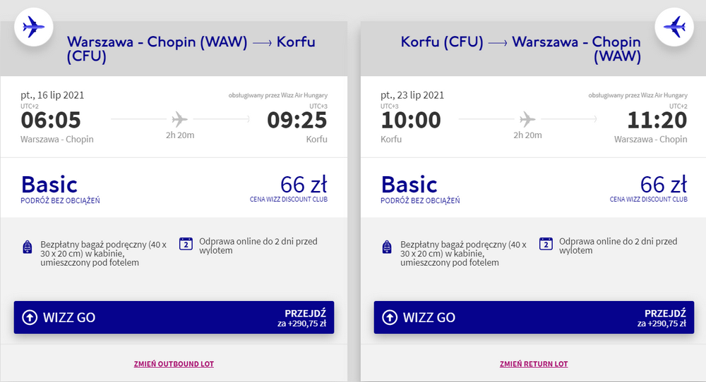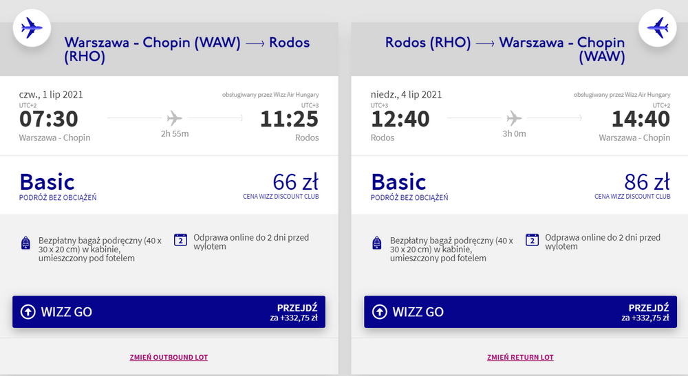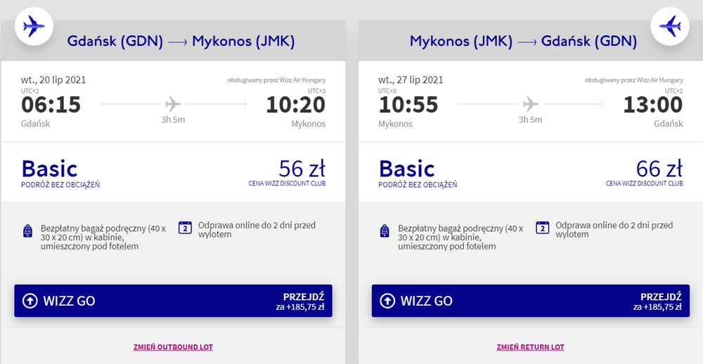 W obie strony podróżować będziecie z gdańskiego, katowickiego, krakowskiego lub warszawskiego lotniska na pokładzie samolotu linii Wizz Air z wliczonym małym bagażem podręcznym. Za bilety na Korfu, Kretę, Mykonos, Rodos, Santoryn czy Zakintos zapłacicie od 105 PLN do 205 PLN. Pamiętajcie, że najtańsze loty dostępne są dla członków Wizz Discount Club – osoby bez WDC zapłacą nieco więcej.