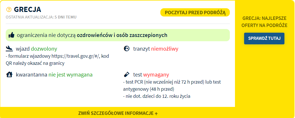 Tanie wakacje w Grecji brzmią kusząco, ale martwią was obostrzenia, jakie panują na greckich wyspach? Niepotrzebnie! Jeżeli należycie do grona ozdrowieńców (osoby, które przechorowały COVID-19) lub jesteście w pełni zaszczepieni szczepionką przeciw SARS-CoV-2 (od podania drugiej dawki minęło już minimum 14 dni), to możecie cieszyć się z beztroskiego urlopu na Korfu, Krecie, Mykonos, Rodos, Santorynie czy Zakintos.