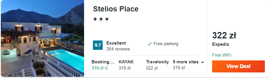 Dowiedzcie się więcej o tym hoteluNatomiast na Santorynie zatrzymajcie się w wyjątkowym 3* hotelu apartamentowym Stelios Place, który znajduje się tuż przy plaży Perissa z czarnym piaskiem. Każdy pokój jest klimatyzowany i wyposażony m.in. w telewizor LCD, zestaw do parzenia kawy lub herbaty, lodówkę oraz łazienkę z prysznicem. Dla gości przygotowano taras słoneczny z leżakami oraz odkryty basen.