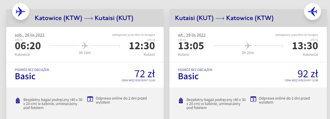 Do Gruzji udacie się w terminie 26 – 29 listopada. Czeka was bezpośredni lot z Katowic, realizowany na pokładzie samolotu linii Wizz Air. Bilety w najniższej cenie zarezerwują posiadacze Wizz Discount Club, pozostałe osoby zapłacą nieco więcej.