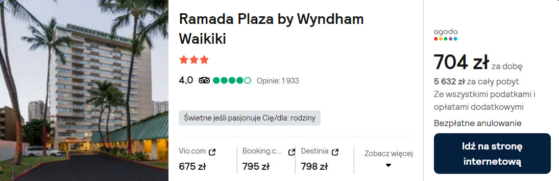 Możesz także rozważyć pobyt w 3* hotelu Ramada Plaza by Wyndham Waikiki, który znajduje się w odległości 10 minut spokojnego spaceru od plaży Waikiki. Wszystkie pokoje są klimatyzowane. W każdym jest łazienka z wanną i prysznicem.