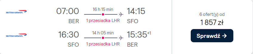Wyjazd do USA składa się z dwóch oddzielnych rezerwacji przelotów. Pierwszym etapem jest lot na trasie Berlin-San Francisco-Berlin, który odbędziesz na pokładach samolotów linii American Airlines oraz British Airways. Po drodze czekać cię będzie wygodna przesiadka na lotnisku w Londynie.