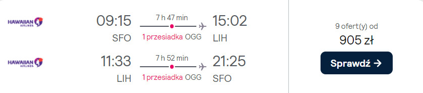 Druga część to podróż z Kalifornii na Hawaje. Od ciebie zależy, na którą wyspę się zdecydujesz: O’ahu, Kauaʻi czy Maui. Niezależnie od decyzji, zawsze polecisz na pokładzie samolotu linii Hawaiian Airlines. Bez dodatkowych kosztów całą wycieczkę odbędziesz z bagażem podręcznym oraz przedmiotem osobistym (małym plecakiem i damską torebką).