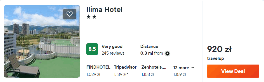 Jesteś w stanie wydać nieco więcej na noclegi? W takim razie postaw na pobyt w hotelu Ilima, który od plaży w Waikiki oddalony jest także o 700 metrów. Na miejscu jest odkryty basen, bezpłatny parking, a we wszystkich pomieszczeniach korzystać możesz z sieci WiFi.