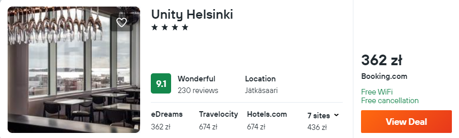 W Helsinkach proponuję ci noclegi w 4* hotelu Unity, który jest bardzo dobrze oceniany przez dotychczasowych gości. Obiekt będzie świetną bazą wypadową do zwiedzania miasta.