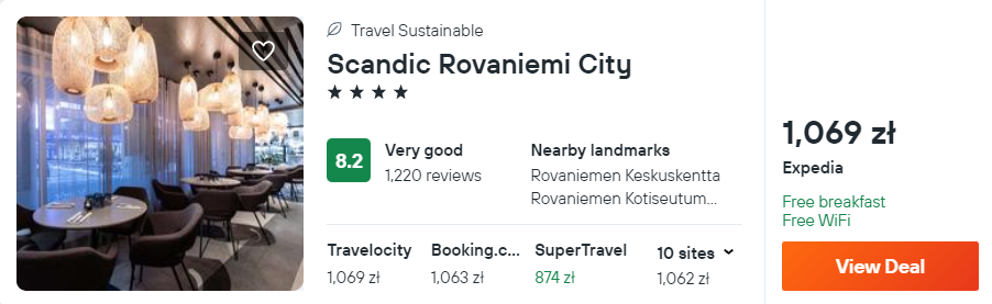 Możesz wydać nieco więcej na zakwaterowanie? W takim razie postaw na 4* hotel Scandic, który mieści się w centrum Rovaniemi. W cenę noclegów wliczono śniadania.