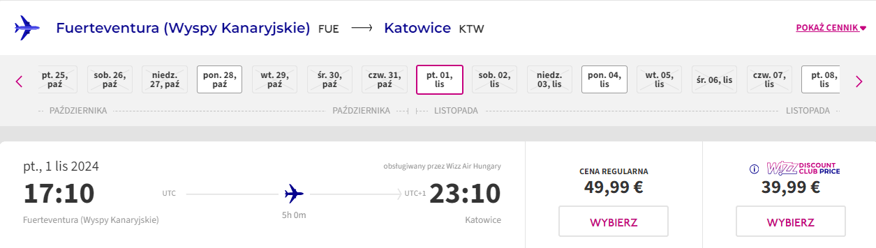 Loty odbędziesz liniami Ryanair, Wizz Air oraz Vueling Airlines z wliczonym bagażem podręcznym. Bilety na trasach (Katowice-Barcelona oraz Fuerteventura-Katowcie) w najniższej cenie dostępne są dla członków Wizz Discount Club. Chętni na loty bez WDC zapłacą więcej. Natomiast pozostałe loty w podanych cenach dostępne są dla wszystkich chętnych.