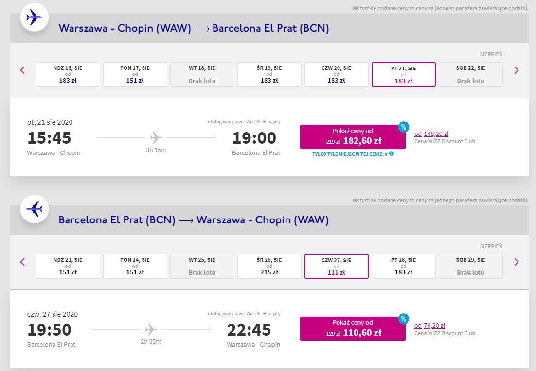 Promocja potrwa do 23:59 5 czerwca 2020 r. – nie zwlekajcie zatem z rezerwacjami. Bilety w obniżonych cenach mogą zakupić zarówno członkowie Wizz Discount Club, jak i osoby nie posiadające takiego statusu. W ramach akcji możecie dowolnie przebierać pośród tras do Hiszpanii – na przykład do Barcelony lub na Teneryfę.