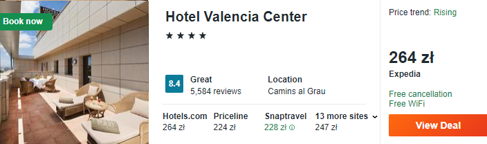 Na czas waszego pobytu w Walencji polecam wam zatrzymać się w 4* hotelu Valencia Center. To wysokiej klasy obiekt, który wyróżnia się luksusem i elegancją. Poza tym będziecie mogli skorzystać z basenu i siłowni.