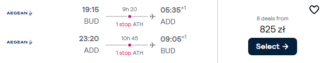 Bilety w tak niskiej cenie kupisz na podróże z wylotem z Budapesztu np. w terminie 24 maja – 2 czerwca. Czeka cię lot z Aegean Airlines oraz Ethiopian Airlines, a po drodze przesiądziesz się w Atenach.