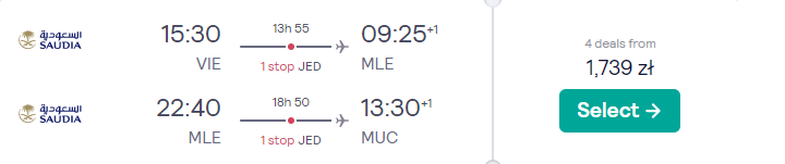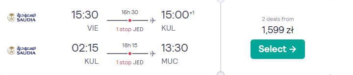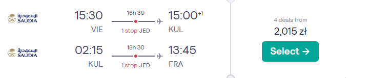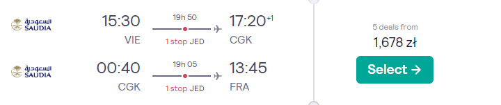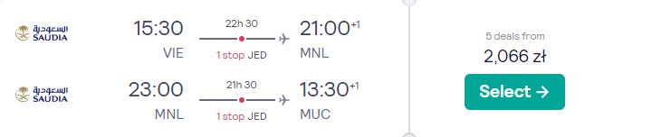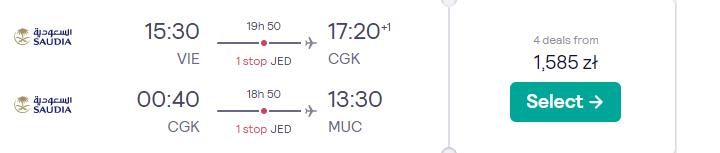 Do Azji udacie się na pokładzie samolotów linii Saudia. Po drodze czekają was przesiadki w Dżuddzie oraz Rijadzie (w zależności od wybranej opcji), a wasza podróż zakończy się we Frankfurcie lub Monachium. W najniższej cenie podróżować będziecie z bagażem podręcznym i rejestrowanym (nadawanym do luku).
