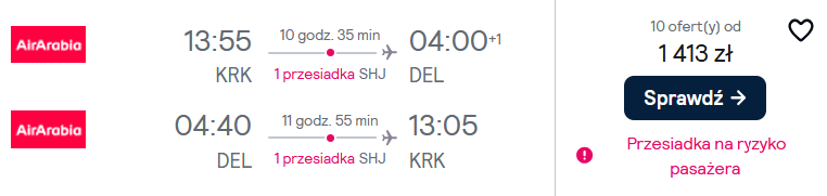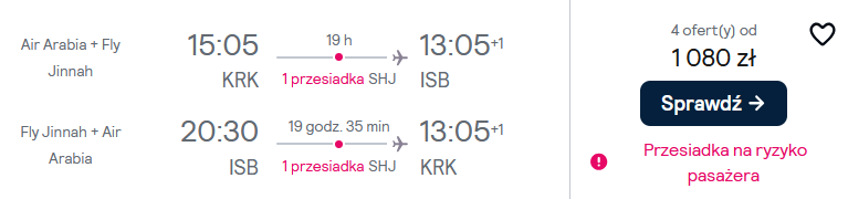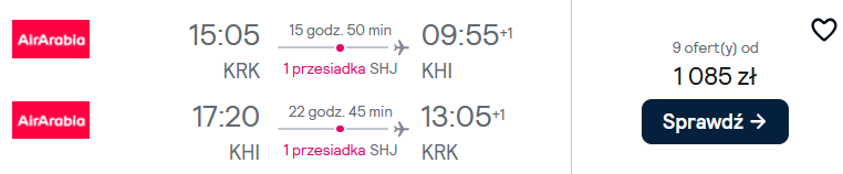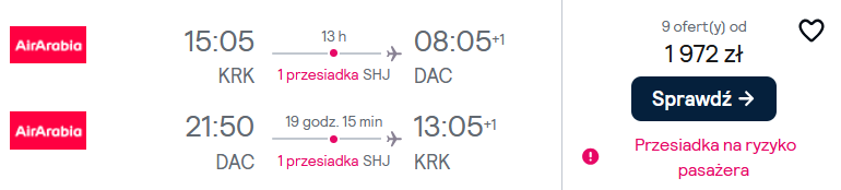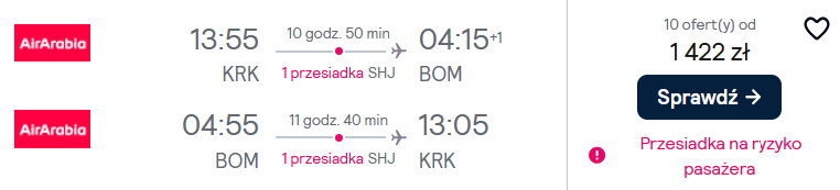 Do Azji wybierzesz się w październiku z lotniska w Krakowie. Do Indii, Pakistanu lub Bangladeszu polecisz linią lotniczą Air Arabia, z przesiadką w Zjednoczonych Emiratach Arabskich. W cenę biletu wliczony jest bagaż podręczny oraz przedmiot osobisty.