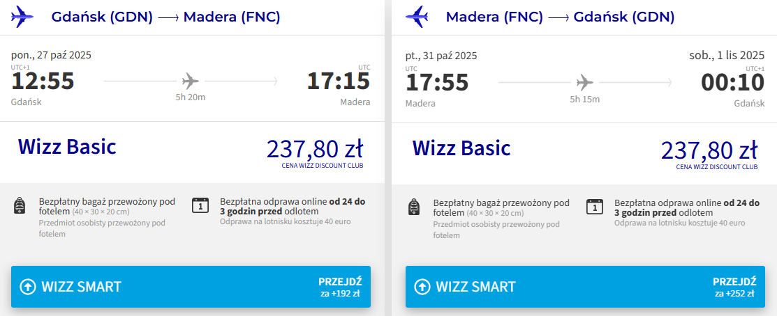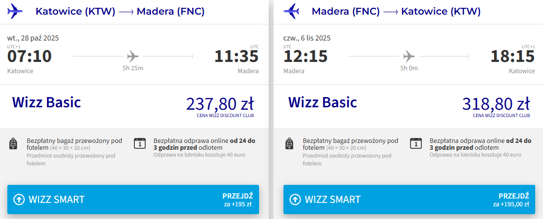 Na Maderę polecisz bezpośrednio z Wizz Air. Do wyboru masz podróże z Gdańska, Katowic lub Warszawy. Bilety w najniższej cenie zarezerwują członkowie Wizz Discount Club, pozostałe osoby zapłacą nieco więcej. W cenie możesz zabrać bagaż podręczny.