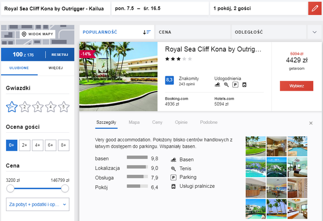 Przykładowa rezerwacja pobytu dwóch osób na Big Island w terminie 7 – 16 maja: