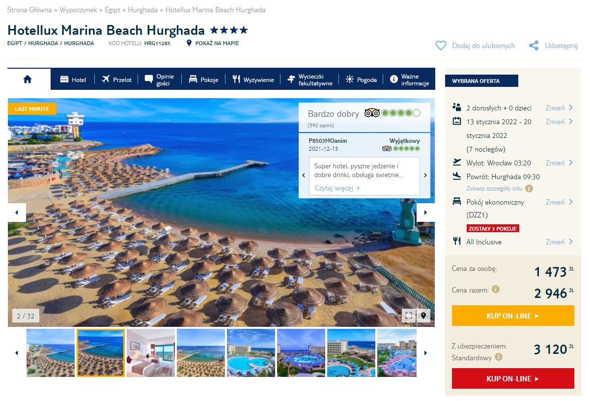 Na wycieczkę do Egiptu udacie się w terminie 13 – 20 stycznia. Tym razem wybierzecie się do Hurghady, gdzie spędzicie aż 7 słonecznych dni w 4* hotelu Hotellux Marina Beach Hurghada. Do dyspozycji gości oddano m.in. prywatną plażę, parasole i leżaki, baseny, bary, tematyczne restauracje, siłownię oraz strefę spa & wellness. Wszystkie pokoje w obiekcie są klimatyzowane, wyposażone w bezpłatne Wi-Fi i posiadają prywatne łazienki.