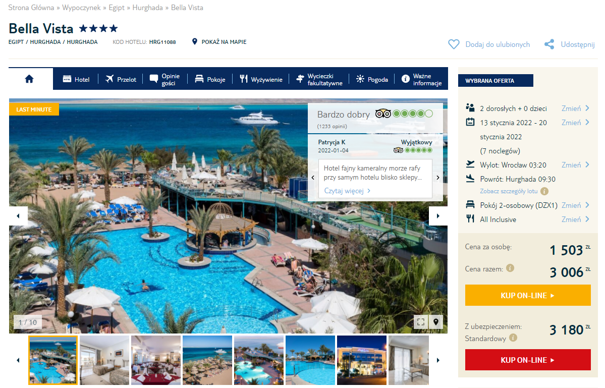 Na wycieczkę do Egiptu udacie się w terminie 13 – 20 stycznia. Na miejscu zatrzymacie się w Hurghadzie, gdzie spędzicie aż 7 słonecznych dni w 4* hotelu Bella Vista. Dla gości przygotowano m.in. prywatną plażę, parasole i leżaki, baseny, bary, tematyczne restauracje, siłownię oraz strefę spa & wellness. Wszystkie pokoje w obiekcie są klimatyzowane, wyposażone w bezpłatne Wi-Fi i posiadają prywatne łazienki.