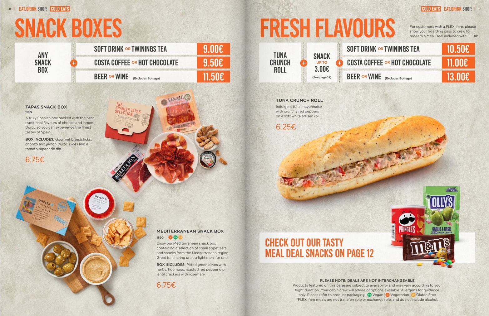 Z kolei linia EasyJet wydaje się kłaść większy nacisk na komfort pasażerów, oferując szerszy wybór na pokładzie. W menu EasyJet znajdziemy napoje Costa Coffee w cenie od 4€ za Americano do 4,50€ za bardziej wyszukane opcje jak np. karmelowe Latte. Kanapki są tutaj w podobnych cenach jak w Ryanair i Wizz Air – za klasyczną kanapkę z tuńczykiem i papryką czy tosta Croque Monsieur 6,25€. EasyJet proponuje też dużo opcji zestawów tzw. „Meal Deal”, których ceny zaczynają się od 9€ za przekąskę i napój lub herbatę, a kończą na 13€ za gorący posiłek z przekąską i piwem lub winem.