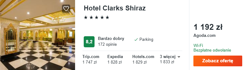 Wybrałem dla was noclegi w świetnie ocenianym, ekskluzywnym 5* hotelu Clarks Shiraz. To miejsce, gdzie złoto dosłownie kapie z sufitów – przekonajcie się sami, jak luksusowo prezentuje się on na zdjęciach.