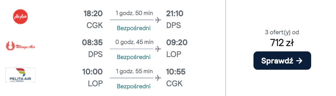 Do Azji udasz się w terminie 13-26 czerwca z lotniska im. Fryderyka Chopina w Warszawie linią Air China, z przesiadką w Pekinie (przystanki możesz wykorzystać na szybkie zwiedzanie miasta). Następnie skorzystaj z oferty lokalnych przewoźników: Wings Air, Air Asia, Pelita Air i zaplanuj loty na trasie Dżakarta-Bali–Lombok–Dżakarta.