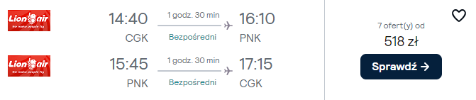 Będąc na miejscu, ruszaj w dalsze, interesujące zakątki Indonezji. Poniżej znajdziesz propozycje lotów na Sumatrę, Bali, Belitung, Borneo, Wyspy Riau, Sulawesi, a nawet do Papui Zachodniej. Polecisz tam, korzystając z usług lokalnych linii lotniczych, a na każdym odcinku wliczony jest bagaż rejestrowany (nadawany do luku).