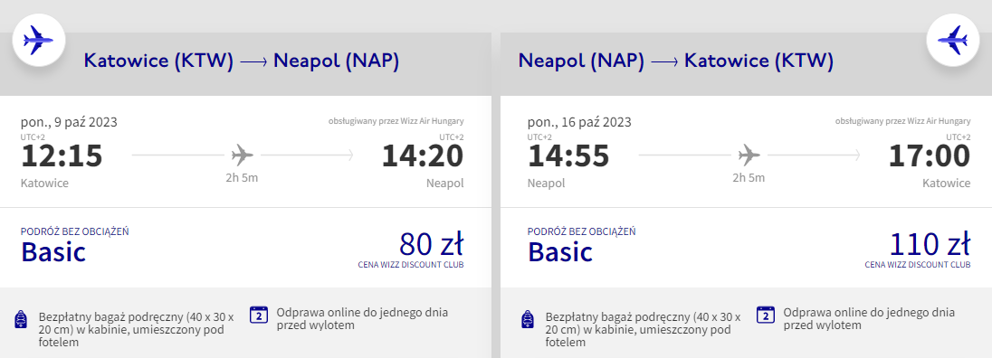 Na wycieczkę udasz się w terminie 9 – 16 października. Czeka cię bezpośredni lot z Katowic do Neapolu, realizowany na pokładzie samolotu linii lotniczej Wizz Air. Bilety w najniższej cenie zarezerwują członkowie Wizz Discount Club, pozostałe osoby zapłacą nieco więcej. Tutaj dowiesz się więcej na temat klubu zniżkowego węgierskiego przewoźnika.