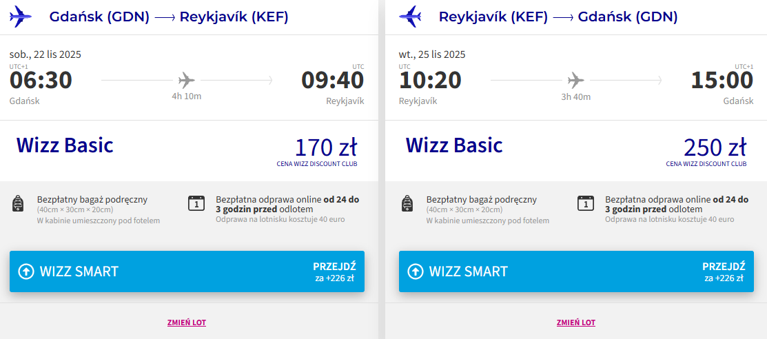 Na wycieczkę wybierzesz się w terminie 22-25 listopada (sobota-wtorek) z lotniska w Gdańsku. Do Reykjaviku polecisz bezpośrednio linią Wizz Air. W cenę biletu wliczony został bagaż podręczny.