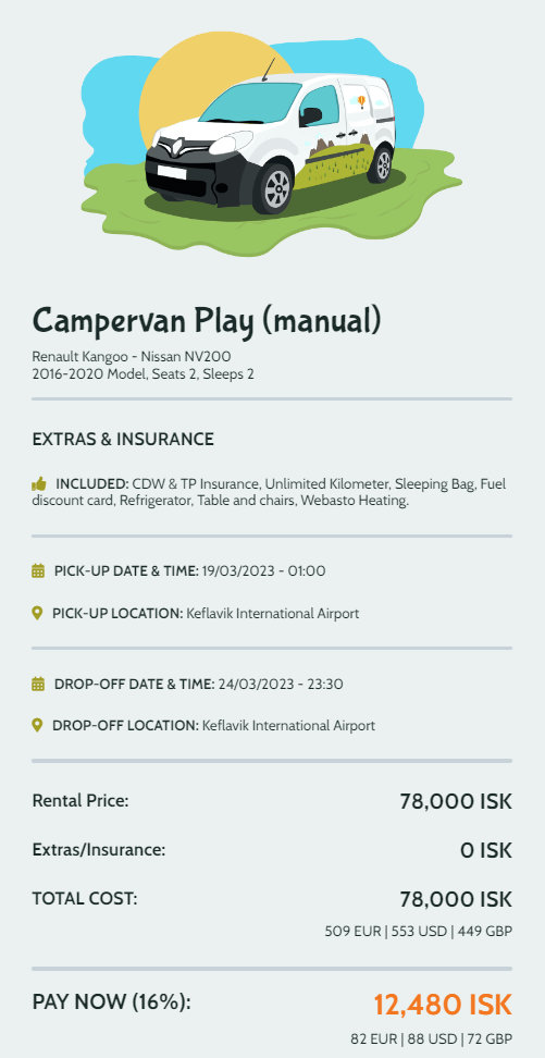 Na Islandii rekomenduję wynajęcie campervana, który ułatwi ci zwiedzanie wyspy, a przy tym będzie miejscem noclegowym. To idealny sposób, by w pełni doświadczyć krainy lodu i ognia. Pojazd wyposażony jest w system ogrzewania, kuchenkę gazową, 2 łóżka, stolik i krzesła.