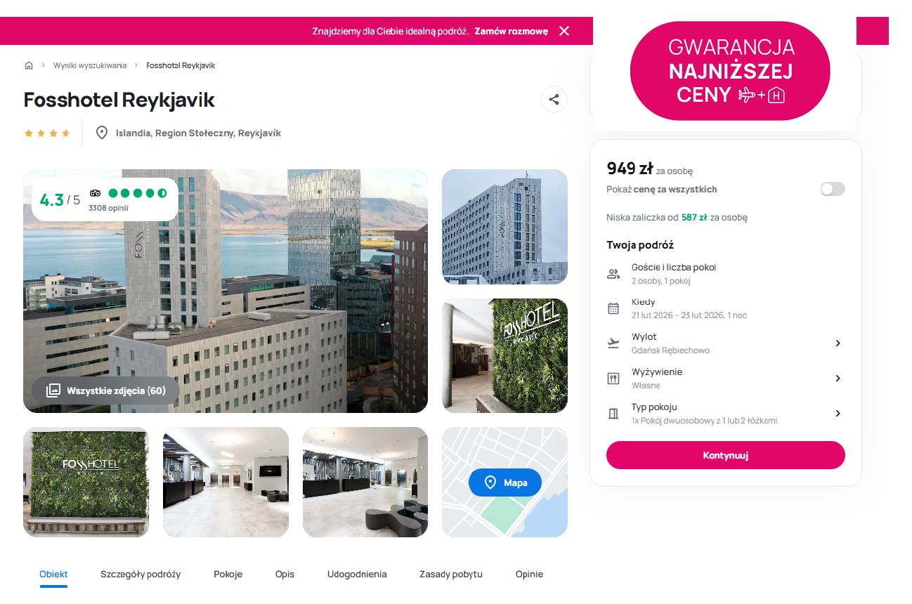 W Reykjaviku zatrzymasz się w bardzo dobrze ocenianym 4* hotelu Fosshotel. Obiekt oferuje komfortowo urządzone pokoje z widokiem na pobliską zatokę i będzie doskonałą bazą wypadową w trakcie krótkiej wycieczki.