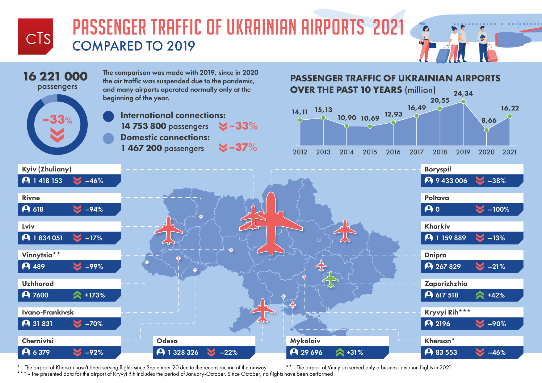 Potem przyszła pandemia, ale w 2021 roku ożywienie ruchu na ukraińskich lotniskach też było wyższe niż w innych krajach w Europie: miejscowe porty obsłużyły w tym okresie 16,221 mln pasażerów.