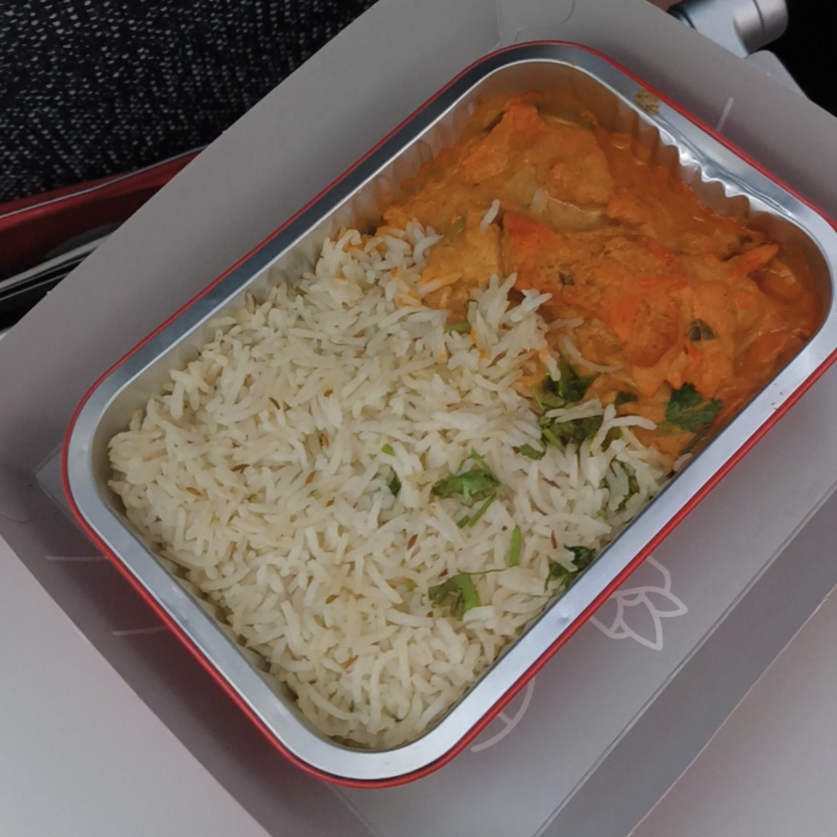 Osobiście skusiłem się na tę ostatnią pozycją i przyznam szczerze… byłem zachwycony! Porcja jest bardzo duża (zdecydowanie większa niż w przypadku darmowego posiłku w Etihadzie), proporcje mięsa, sosu i ryżu świetne, a sposób doprawienia genialny. Nie wiem, czy to nie był najlepszy posiłek, jaki kiedykolwiek jadłem w samolocie.