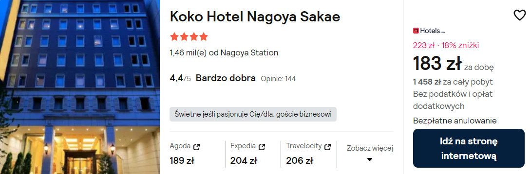 W Nagoi rekomenduję ci noclegi w 4* hotelu Koko Sakae, który znajduje się w sąsiedztwie stacji metra Sakae. Na terenie całego obiektu będziesz mieć zapewniony dostęp do sieci WiFi.