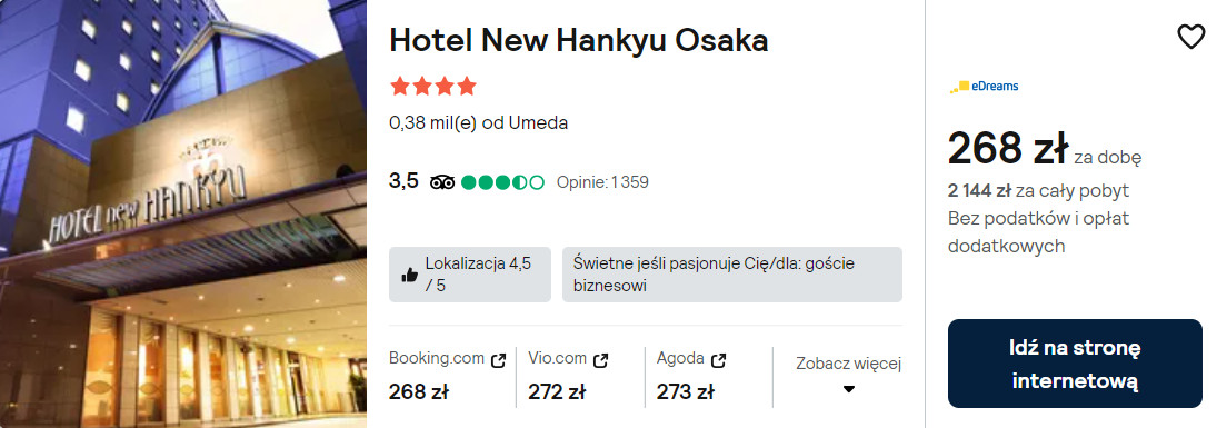 Niewiele więcej kosztować cię będzie pobyt w 4* hotelu New Hankyu, który mieści się w sąsiedztwie stacji Osaka-Umeda. W każdym pokoju jest klimatyzacja, telewizor LCD, lodówka oraz zestaw do parzenia kawy lub herbaty.