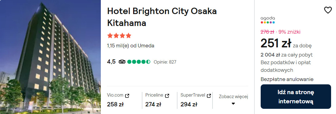 W Osace postaw na zakwaterowanie w 4* hotelu Brighton Kitahama, który znajduje się w sąsiedztwie stacji metra Kitahama. Każdy pokój wyposażony jest w klimatyzację, telewizor LCD, minibar oraz zestaw do parzenia kawy lub herbaty.