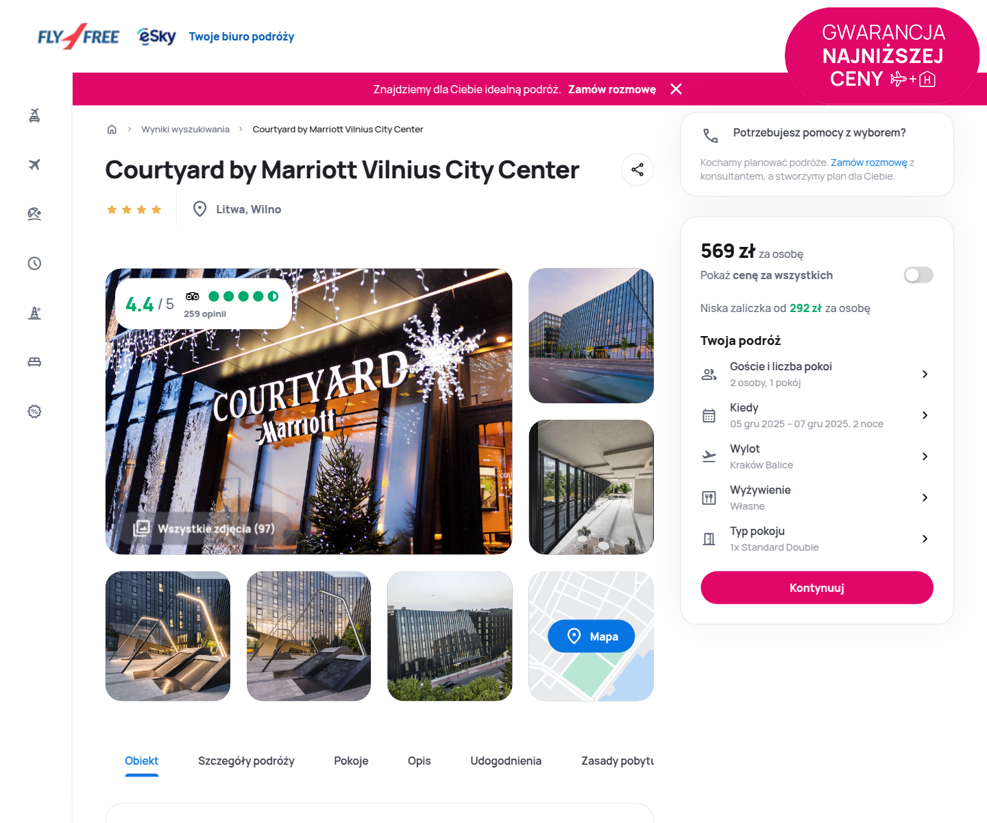 Na miejscu czeka na ciebie luksusowy 4* hotel Marriot, zlokalizowany w centrum miasta, co sprawia, że będzie to idealna baza do zwiedzania. Wilno to miasto pełne historycznych atrakcji – koniecznie odwiedź starówkę wpisaną na listę UNESCO, Ostrą Bramę oraz wieżę Giedymina. W grudniu szczególnie warto zobaczyć choinkę na placu Katedralnym, uznawaną za jedną z najpiękniejszych w Europie.